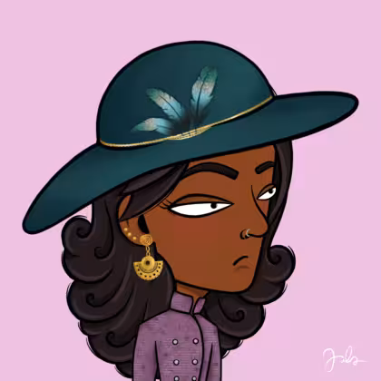 Collection Depressed Citizens Artist Juls Description ART. No team, no project, no future. Depressed Citizens is an urban & existential Art expression on Ordinals. In a parallel universe, "THEI" control us. DC unites against toxic society, encouraging critical thinking. 100% hand made collection that took Juls more than 6 months of daily work. Name Citizen#409 Origin African descendant Gender Woman Necklace No Necklace Hat Floppy feather hat Mustache Beard No beard Glasses No Glasses Earrings Ball earrings trio Hair Style Long wavy Clothes Not visible T-shirt Tattoo No Tattoo Star Background Without stars