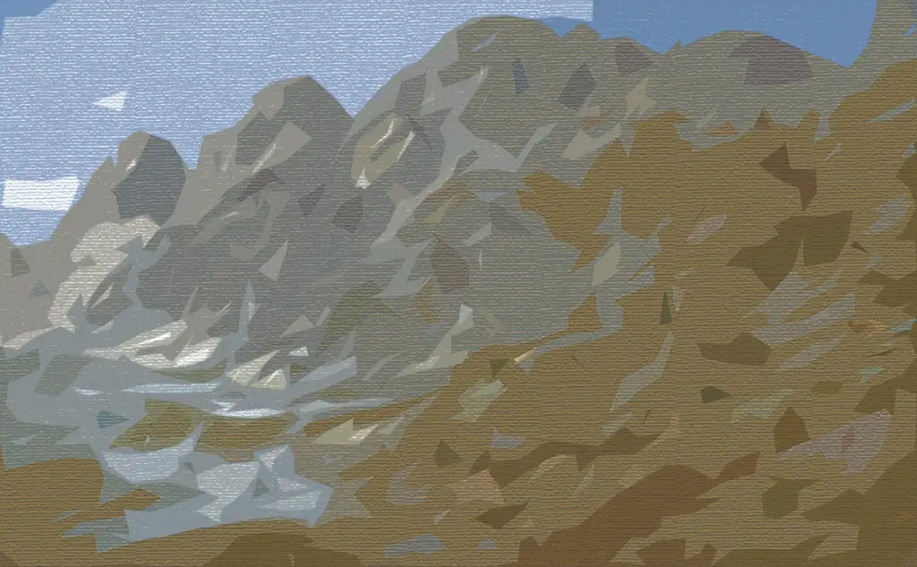 Each piece begins with original landscape photography, transformed through GAN-based machine learning into abstract terrains, then manually refined into simplified digital compositions. The final works are inscribed onto satoshis shared with cursed ordinals deemed valueless—cursed, floored, and rejected.